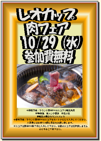 おすすめキャンペーン情報 2017-02-08 レオカップ・肉フェア(参加費無料のハーフコンペ) ※写真はイメージです。 レオカップ 参加費無料のハーフコンペ開催! 毎月最終水曜日開催の参加費無料のハーフコンペです。 商品は各月ごと、季節に応じて変わります。 ホールアウト後に集計結果を待つこともなく、ホールアウト時には入賞結果が... 続きを見る