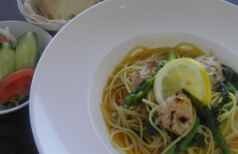 - 菜の花と炭焼き鶏のペペロンチーノ
